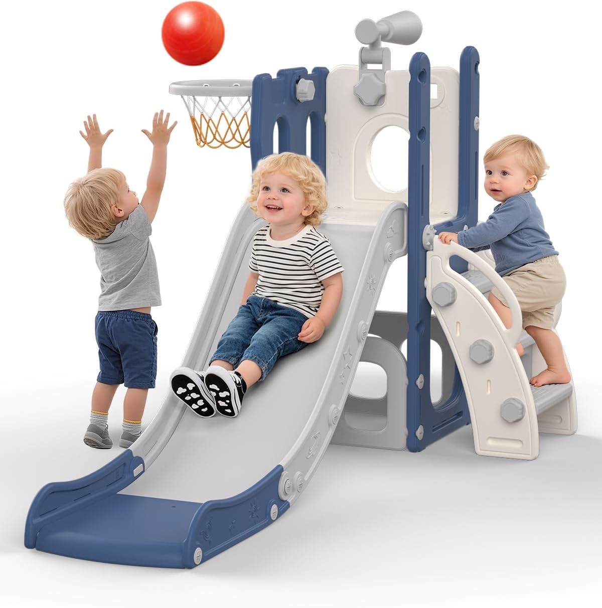 Plastic Kids Slide with Ladder, Basketball Hoop & Toy Telescope, Indoor & Outdo