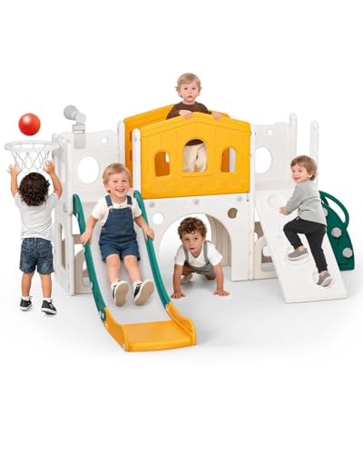 hoopyosms Large Plastic Kids Slide with Ladder, Platform, Crawling Tunnel, Climbing Ramp, Basketball Hoop & Toy Telescope, Indoor & Outdoor Activity Playset for Toddlers & Preschoolers(Green)