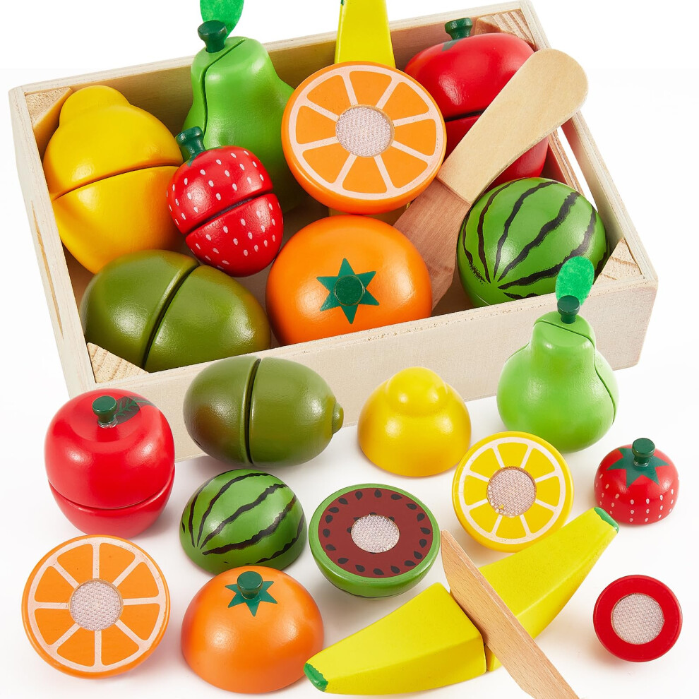 LINFUN KIDS Fruit Cutting Set Wooden Play Food for 2+ Year Olds Toddlers, Food Toys Kids Role Play Kitchen Accessories with Baskets Gifts age 3 4 5 Boys Girls