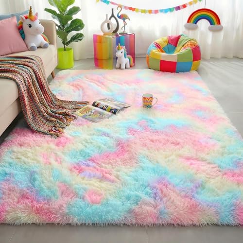 Rainbow Runner Unicorn Room Decor, Pastel Shag Carpet for Kids, Soft Play Mat for Baby, Fuzzy Living Room Mat