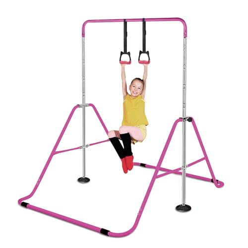 Triclicks Gymnastics Bar, Folding Horizontal Bar with Gymnastic Rings Kids Boys Girl Gymnastics Training Equipment, Adjustable Height Junior Training Bar Kip Bar for Home Gym Indoor Garden (Pink)