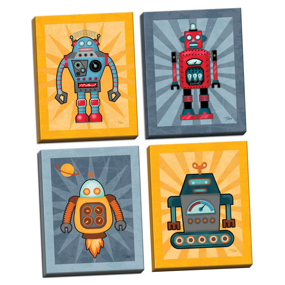 Adorable Robot Poster Set; Kids Room Decor; Four 11 x 14 Hand-Stretched Canvases