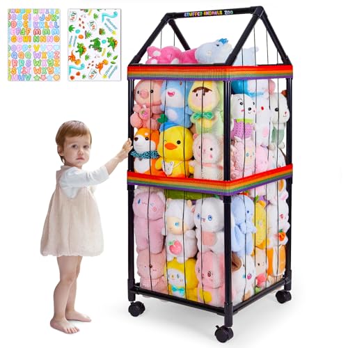 MHJY Stuffed Animals Zoo Storage with Wheels, Soft Toy Storage Cage PVC Cuddly Toy Holder Large Plushies Organiser Shelf with Elastic Band for Kids Room Furniture Bedroom Nursery Decor