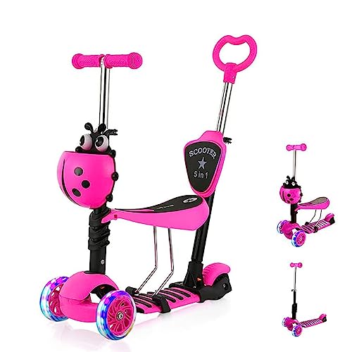 Dripex 5-in-1 Kids Scooter Toddler Scooter with Flashing Led Light Up Wheels 3 Wheels Kick Scooter with Adjustable Handlebar Removable Seat and Push Handle (Pink)
