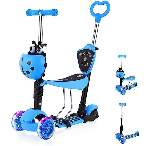 Dripex 5-in-1 Kids Scooter Toddler Scooter with Flashing Led Light Up Wheels 3 Wheels Kick Scooter with Adjustable Handlebar Removable Seat and Push Handle (Blue)