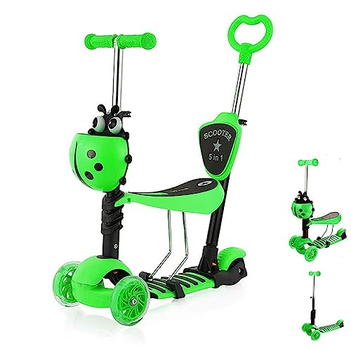5-in-1 Kids Scooter, 3 Wheels Scooter Kick Scooter with Adjustable Removable Seat and Push Handle, Lightweight Toddler Scooter with Flashing Led Light Up Wheels for Boys and Girls (green)