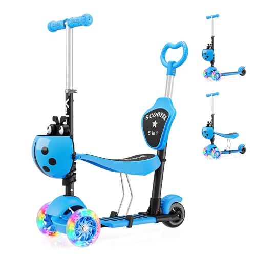 YOLEO 5-in-1 Kids Scooter with Removable Seat, LED Flashing Wheels Height Adjustable 3 Wheels Kick Scooter with Push Handle for Toddlers, Boys and Girls from 2 Years (Blue)