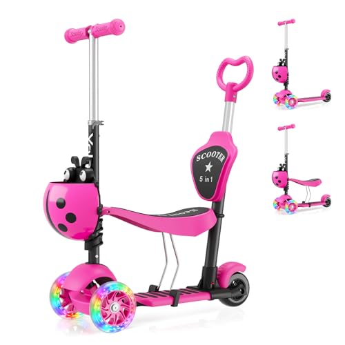 YOLEO 5-in-1 Kids Scooter with Removable Seat, LED Flashing Wheels Height Adjustable 3 Wheels Kick Scooter with Push Handle for Toddlers, Boys and Girls from 2 Years (Pink)