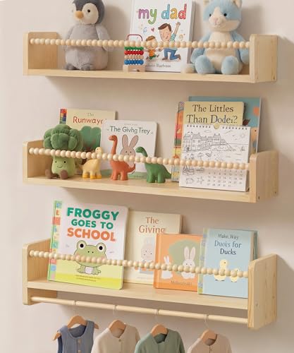 Mazjoaru Nursery Shelves Floating Book Shelf for Wall, Kids Shelves for Bedroom Baby Bookshelf Decor, Solid Wood 60cm Long Shelving Organizer With Wooden Bead Design Set of 3