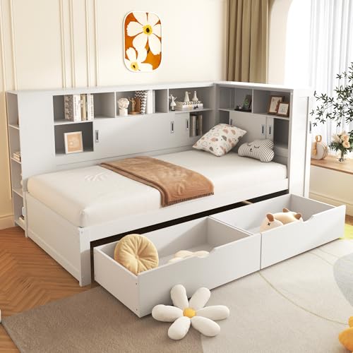 3ft Single Bed Frame with Trundle & Bookcase & USB, Multifunctional Platform Bed with 2 Storage Drawers & Dust-Proof Cabinet & Shelves, Kids Pine Wood Storage Beds with Slatted Frame, White, 90x190cm