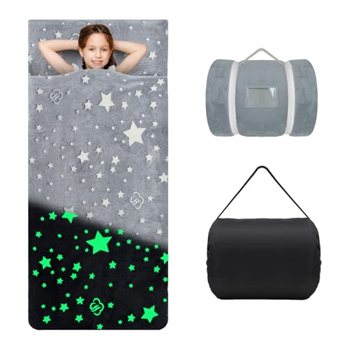 Kids Sleeping Bag with Pillow,Glow in The Dark Nap Mat for Toddlers Boys Girls,Large & Comfy Plush Slumber Bag for Sleepovers Camping Travel,Star Grey