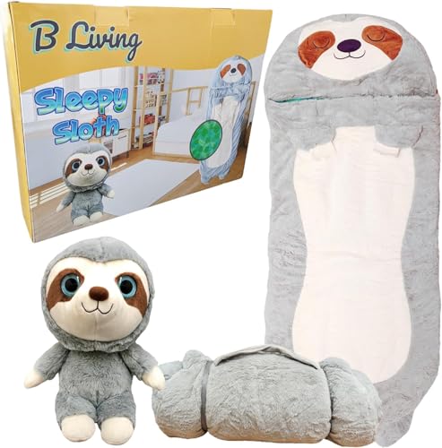 Kids Sleeping Bag With Pillow - Large Sleeping Bag For Children With Cute Plush Toy. Sloth Animal Sleeping Bags For Kids, Foldable Cosy Nappers For Sleepover, Happy Napping For Boys And For Girls.