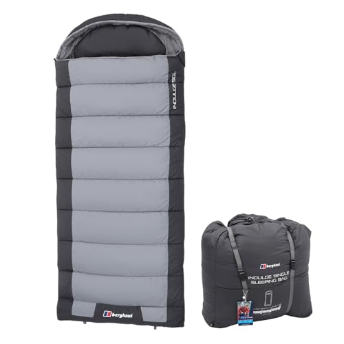 Berghaus Indulge Single Sleeping Bag with Built-in Pillow for Adults, Teens, Kids, 1 Person, 2-3 Season, Waterproof (Grey, Single)