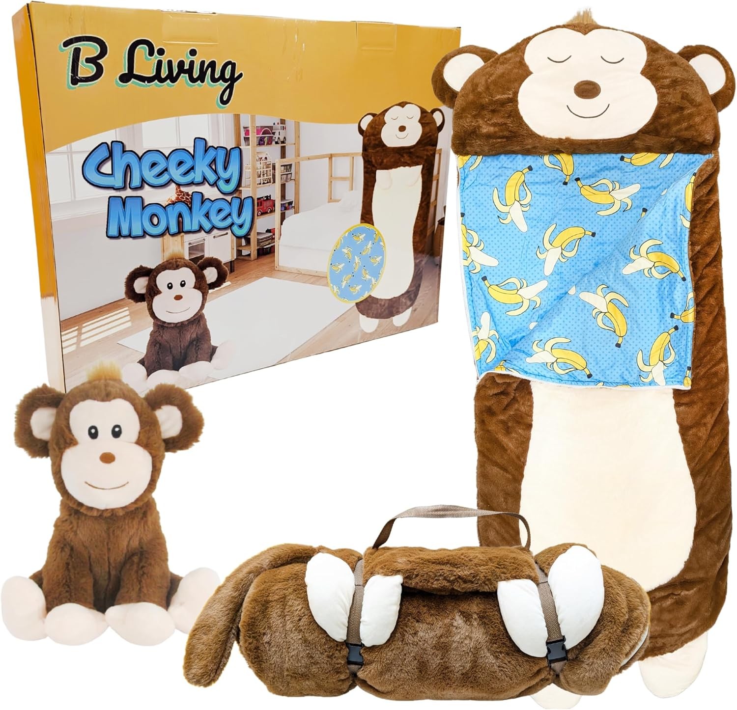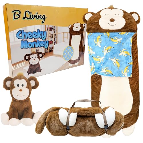 Kids Sleeping Bag With Pillow - Large Sleeping Bag For Children With Cute Plush Toy. Monkey Animal Sleeping Bags For Kids, Foldable Cosy Nappers For Sleepover, Happy Napping For Boys And For Girls.