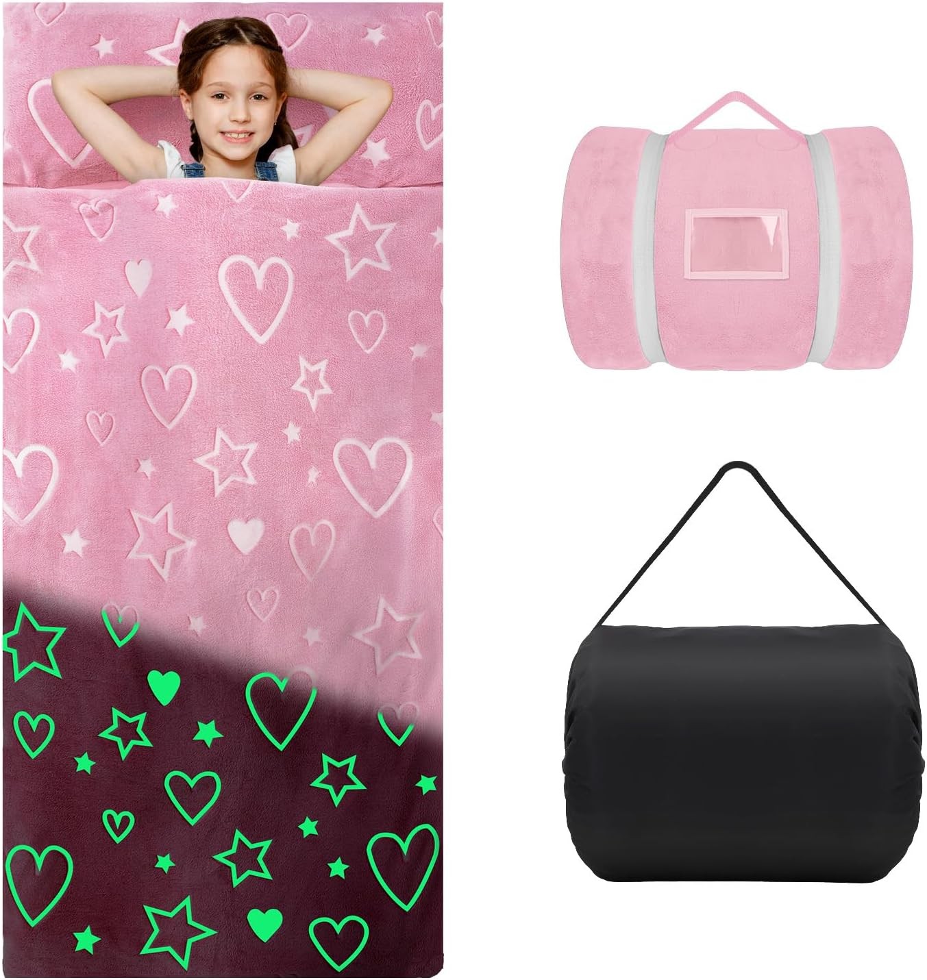 Kids Sleeping Bag with Pillow,Glow in The Dark Nap Mat for Toddlers Girls,Large & Comfy Plush Slumber Bag for Sleepovers Camping Travel,Pink Heart