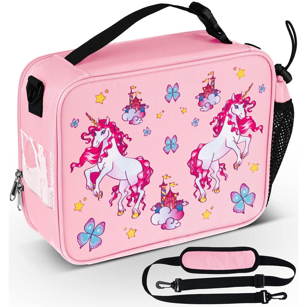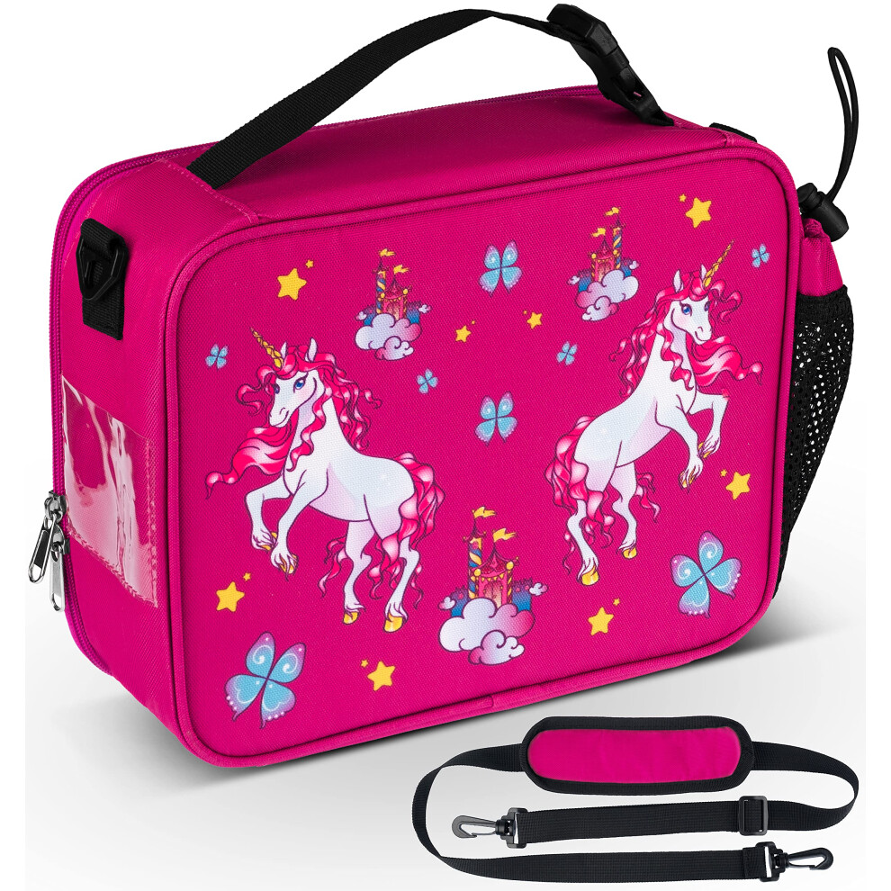 Insulated Unicorn Kids Lunch Bag for Girls Child with Bottle Holder, Carry Handle & Shoulder Strap, Kids Lunch Box Snack Box Thermal Tote Cooler Bag