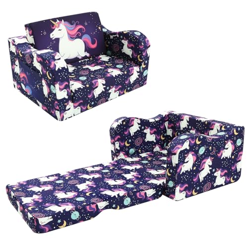 Decalsweet Kids Sofa,Foldable Toddler Chair,2 in 1 Flip Out Kids Sofa Bed,Comfy Plush Toddler Couch for Bedroom Nursery,Gift for Girls,Unicorn