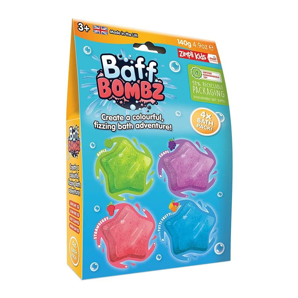ZIMPLI 4 x Baff Bombz, Create a Colourful, fizzing, bathtime Adventure, Children's Bath Bombs Gift Set, Kids Stocking Fillers, Organic, Natural