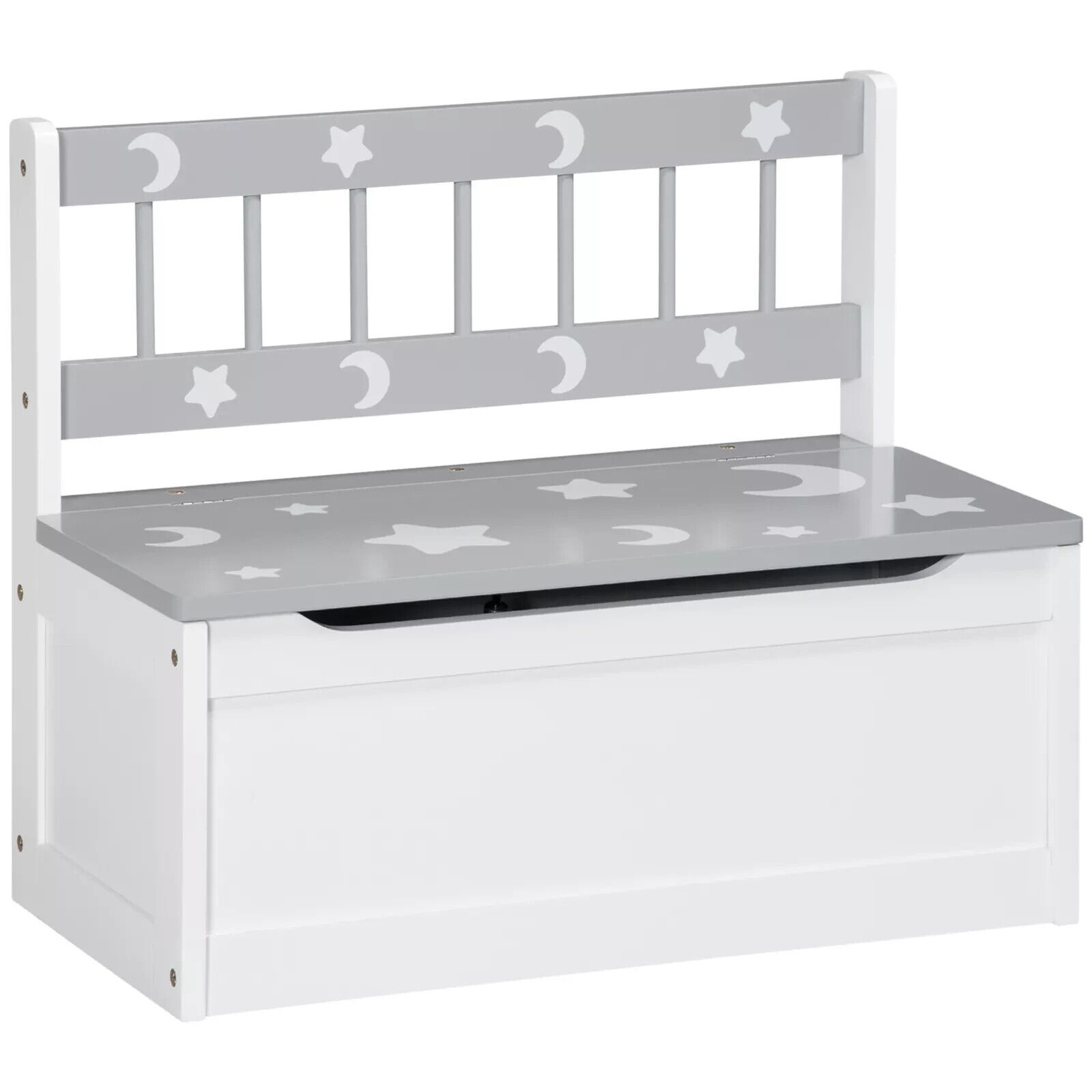 Zonekiz 2-in-1 Wooden Toy Box, Kids Storage Bench Toy Chest With Safety Pneumatic Rod, Star & Moon Pattern, Grey