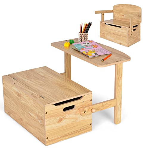 GYMAX 3 in 1 Kids Storage Bench, Convertible Toy Storage Box with Safety Hinge, Wooden Children Table and Chair Set for Playroom Bedroom (Natural)