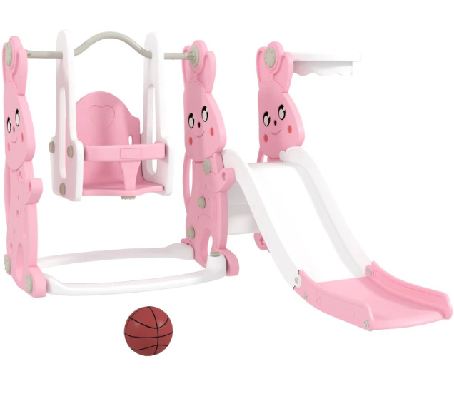 4 in 1 Kids Slide and Swing Set with Climber Basketball Hoop Rabbit Themed Pink