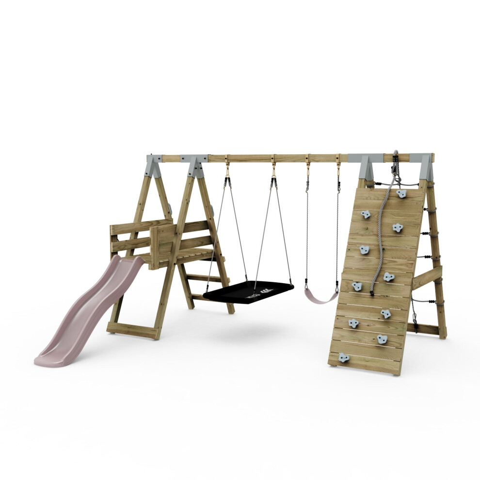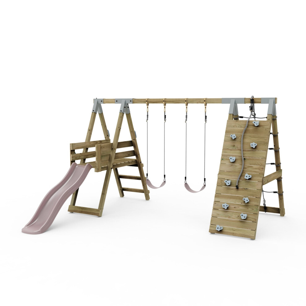 Rebo Adventure Wooden Garden Climbing Frame, Swing Set and Slide for Kids - Snowdon Pink