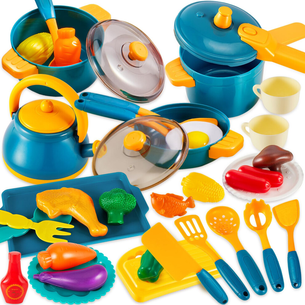 GSrenyu Kids Kitchen Toy Accessories Set, Cooking Cookware Toys Pots and Pans Playset Role Play Cutting Fruit Food Toy Kitchen Pretend Toy for Kids Girl Boy Toddler 3 4 5 6 Years Old