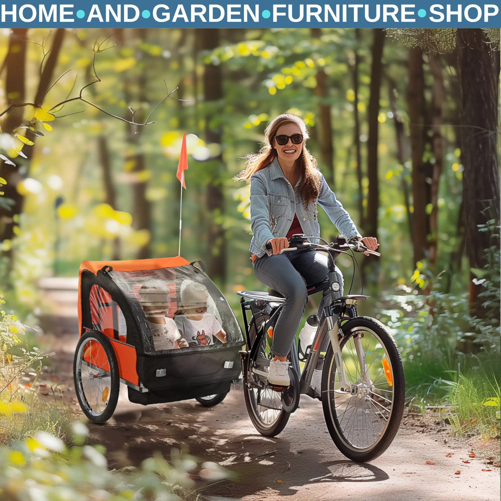 Kids Bike Trailer 2-Seater Bicycle Wagon Durable with Roll-Up Door Orange/Black