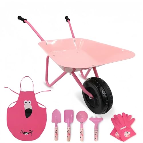 Hortem Kids Wheelbarrow Set Metal, 5PCS Construction Kids Wheel Barrel and Kids Garden Tools,Kids Gardening Glove, Gifts for Kids (Pink)