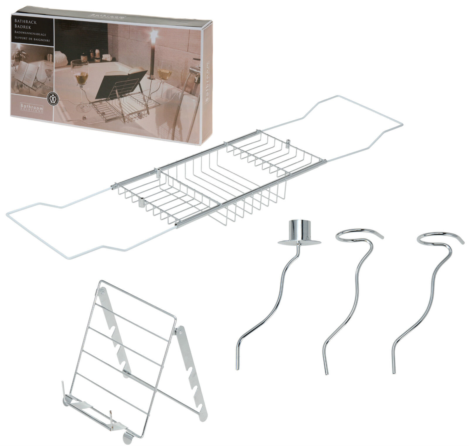 Chrome Extendable Bath Rack with Book/Kindle Holder Wine Glass & Candle Holders
