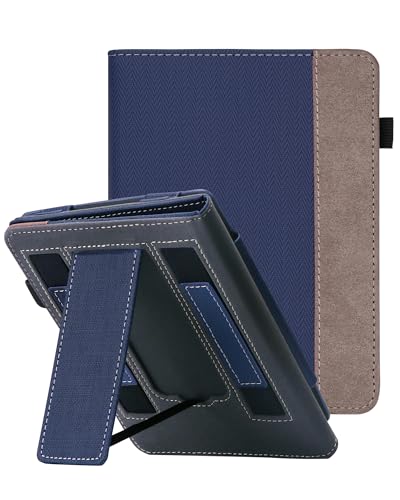 WALNEW Stand Case for 7" All-New Kindle Paperwhite 12th Generation (2024 Released) and Kindle Colorsoft Signature Edition, Two Hand Straps Shell PU Leather Cover with Auto-Wake/Sleep (Navy Blue)