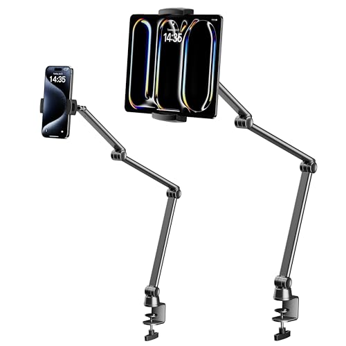 LULULOOK Tablet Stand with 2 Clips, Aluminum Alloy Stretchable Arm Phone Holder Mount, Adjustable Kindle Stand Compatible with iPad Pro Air Mini 11/12.9", Galaxy Tabs, Phones, Kindle, Tablet 4.7"-13"