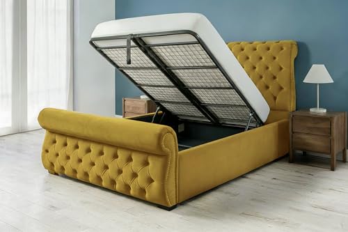 Super King Bed with Storage | Ottoman Bed Super King size (6ft), Gas Lift Up Bed Frame, Upholstered Bed with Base and Headboard, Heavy Duty Mesh Frame Sleigh Bed (Mustard)(Spanish Swan)