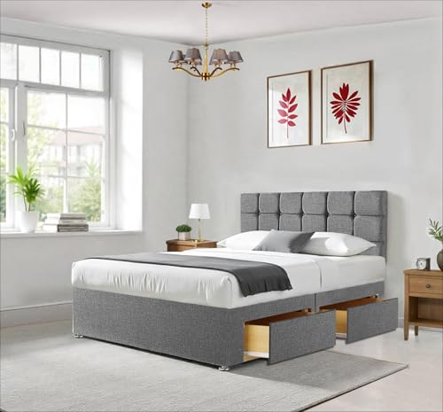 Divan Beds Deals – Luxury Grey Linen Look Divan King Size Bed with 2 Storage Drawers | Upholstered Bed Frame with Spring Memory Foam Mattress & Stylish 20” Cube Headboard | Divan Bedroom Furniture