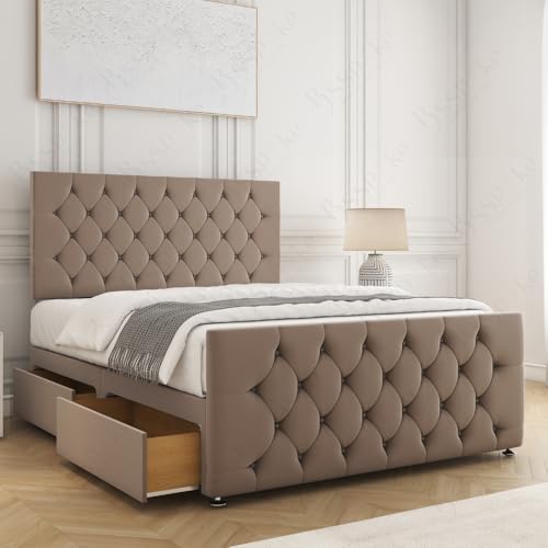 BSSPOKE Plush Maya Divan King Size Bed with Mattress + 2 Drawers + 24” Matching Headboard & 20” Footboard, Hand Made Bed Fabric Buttons (Mink, King (150 x 200 cm))