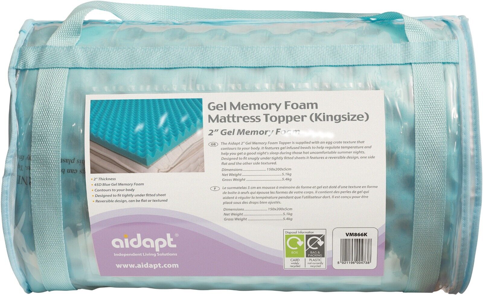Gel Memory Foam Topper Standard King Matress 2" 45D Blue Reversible Contour
