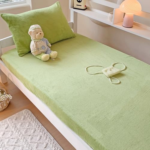 FCLDESHOP Bedding King Fitted Sheet,Winter Warm Coral Fleece Fitted Bed Sheet, Student Dormitory Solid Color Skin-Friendly Mattress Protector,Green,100x200cm+15cm (2pcs)