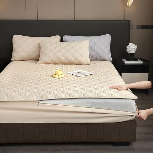 Fitted Quilted Mattress Protector Single/Double/King Size Thick Mattress Topper Soft Breathable Noiseless Mattress Cover With Extra Deep 30cm Stretch Skirt Bed Fitted Sheet(140x200+30cm,Beige D)