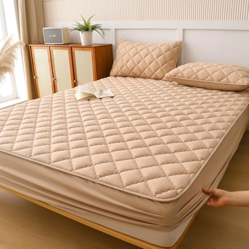 Fitted Quilted Mattress Protector Single/Double/King Size Thick Mattress Topper Soft Breathable Noiseless Mattress Cover With Extra Deep 30cm Stretch Skirt Bed Fitted Sheet(140x200+30cm,Camel D)