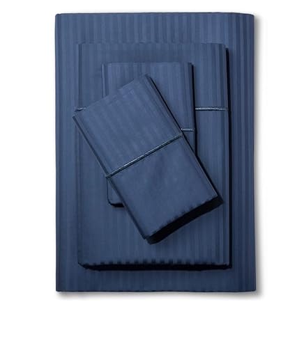 Feather & Stitch 500 TC King Size Damask Bed Sheet Set, 100% Soft Cotton Breathable Bedsheets, 18" Deep Pockets Sateen Weave Striped Bedding Mattress Resort Hotel Luxury Décor - (Dark Blue, King)