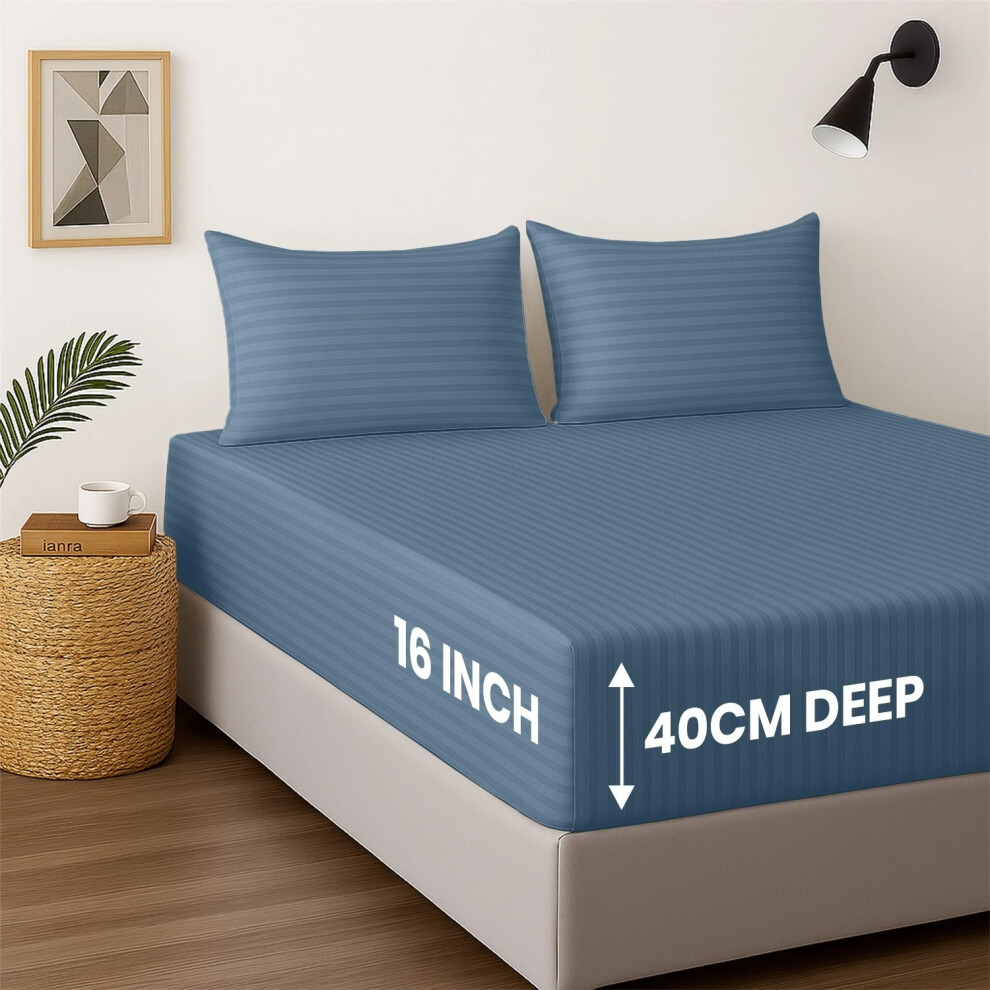 (King Fitted Bed Sheets Pack of 2, Washed Blue) Extra Deep Fitted Sheet 40CM Bed Sheets 2-Pack