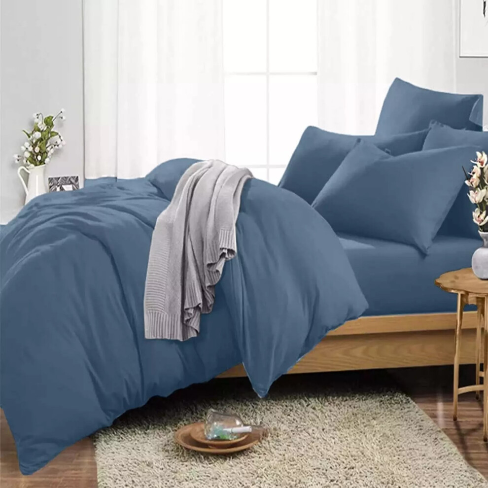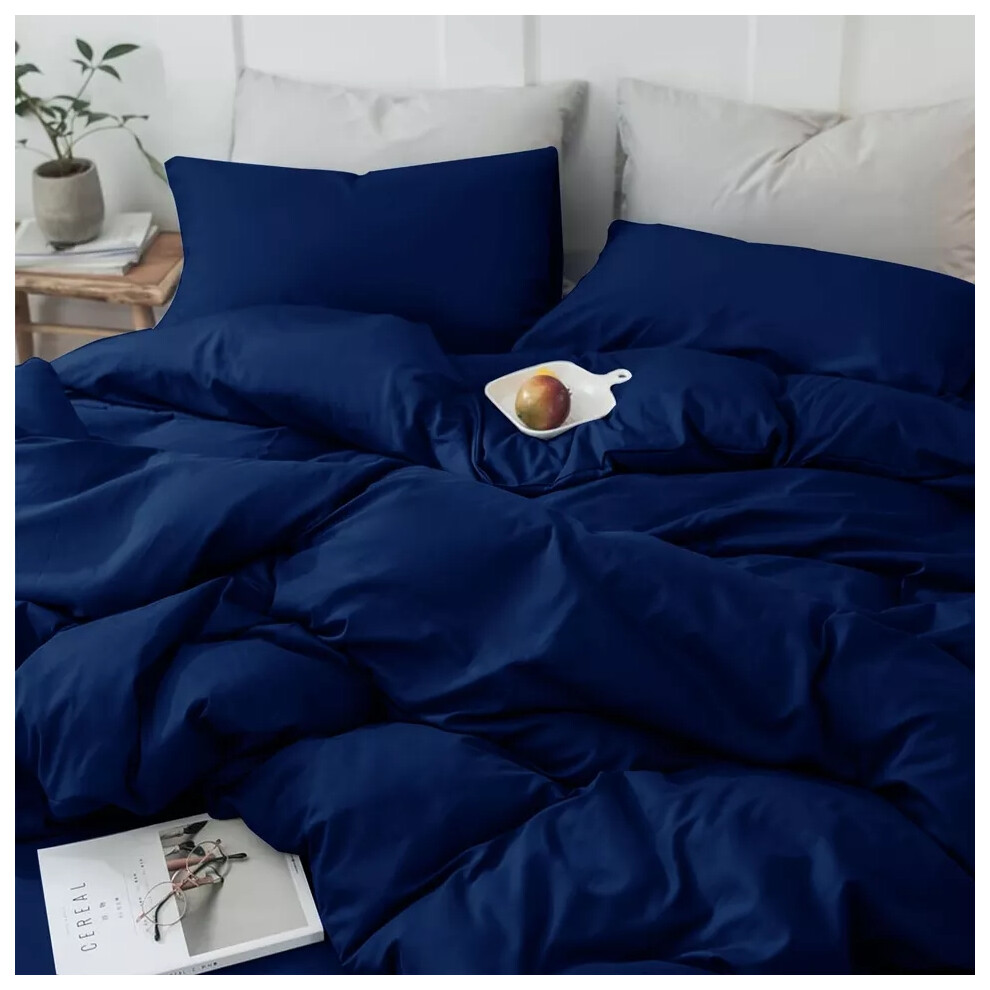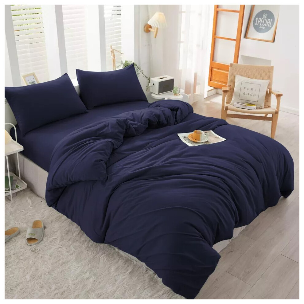 (Navy Blue, Super King Size Set) 4PC Dyed Duvet Cover Bedding Set with Fitted Sheet