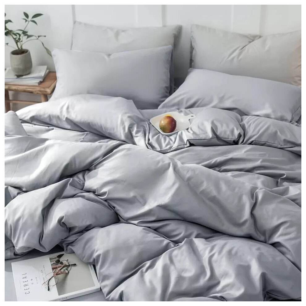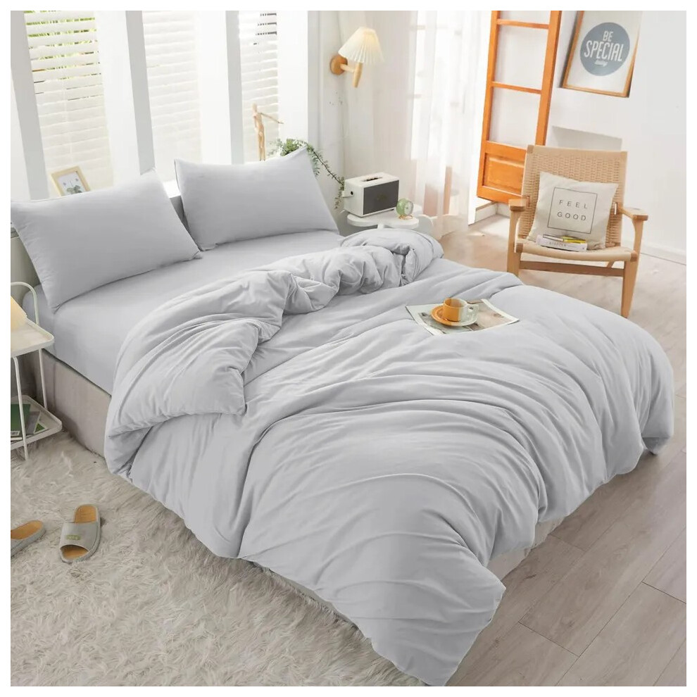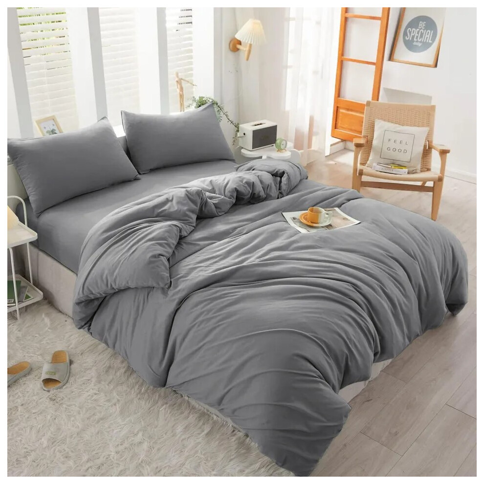 (Grey, Super King Size Set) 4PC Dyed Duvet Cover Bedding Set with Fitted Sheet