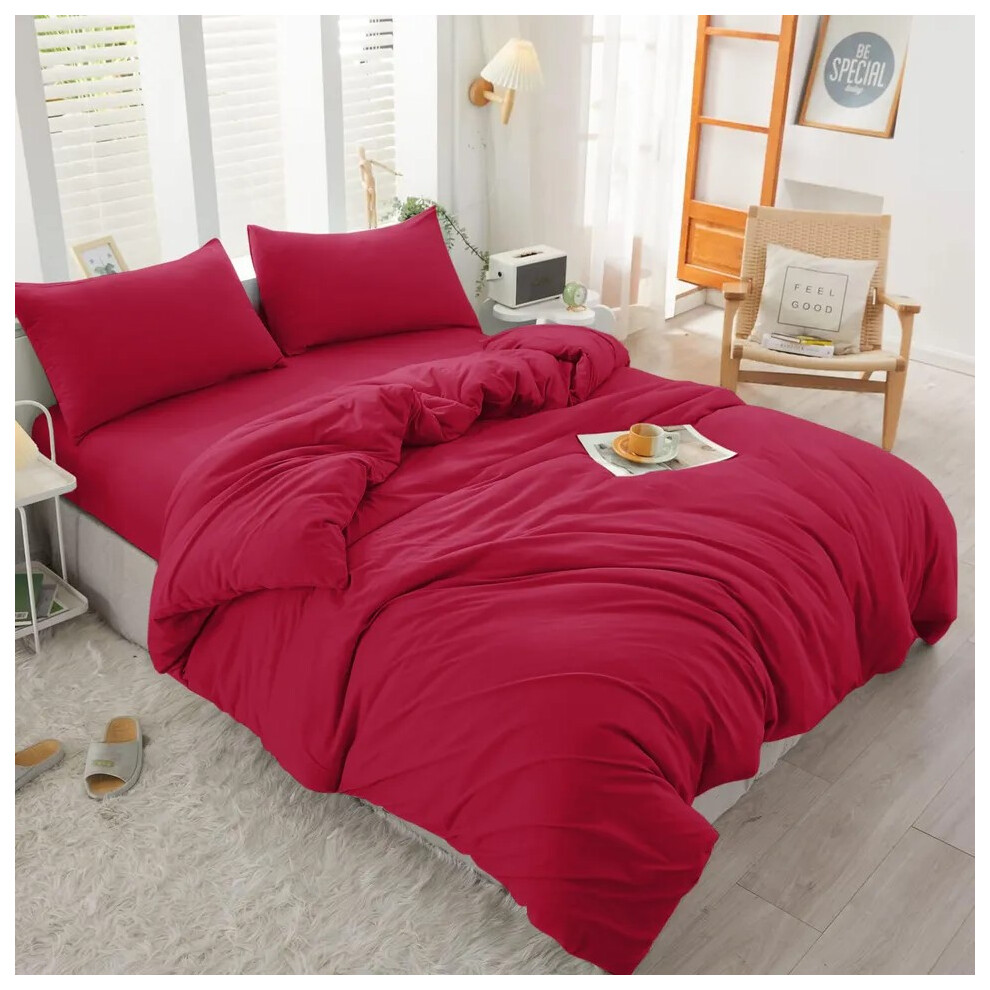 (Burundy Red, Super King Size Set) 4PC Dyed Duvet Cover Bedding Set with Fitted Sheet