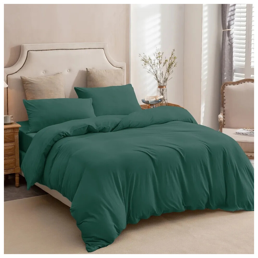 (Emerald Green, King Size Set) 4PC Dyed Duvet Cover Bedding Set with Fitted Sheet