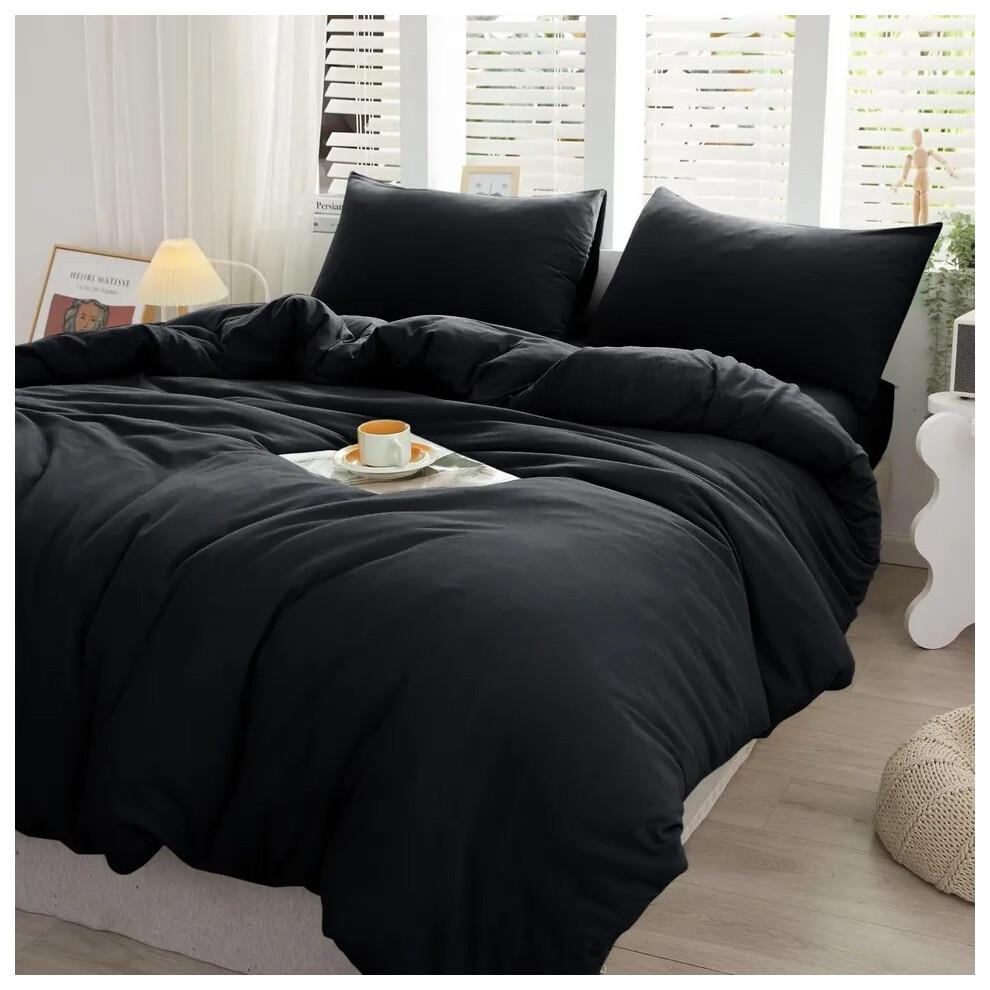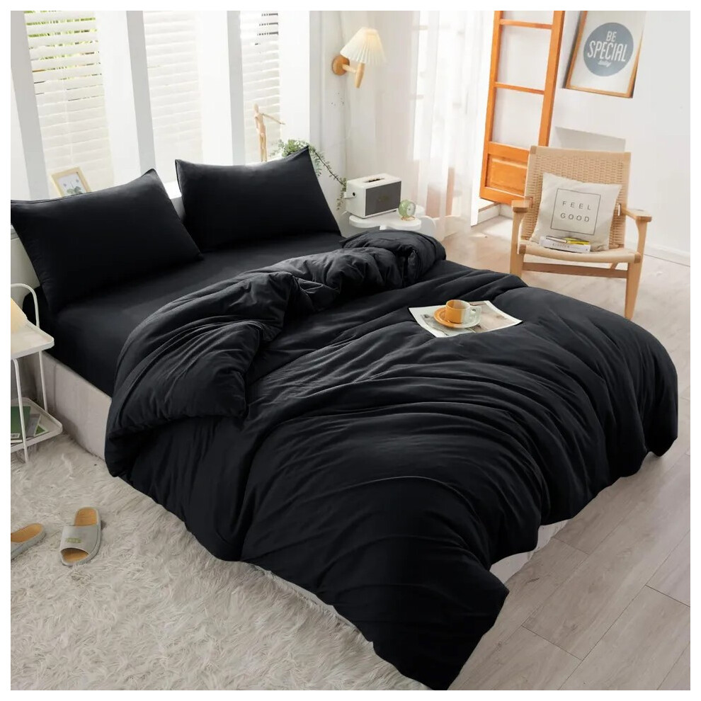 (Black, Super King Size Set) 4PC Dyed Duvet Cover Bedding Set with Fitted Sheet