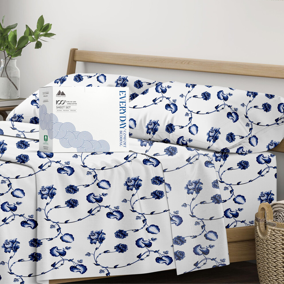 Mayfair Linen 100% Organic Cotton Printed Sheets King Size - 4 PC Organic Cotton Percale Sheets King Set (Floral Blue) Cooling & Breathable Bedsheet