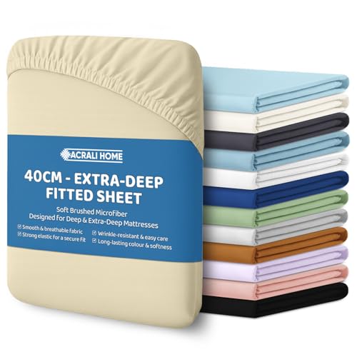 ACRALI HOME King Size Fitted Sheet - Cream Bottom Sheet for King Bed with 40cm Extra Deep Fit Pocket- Hotel Quality Soft Microfiber Bedsheet - Breathable, Shrinkage and Fade Resistant