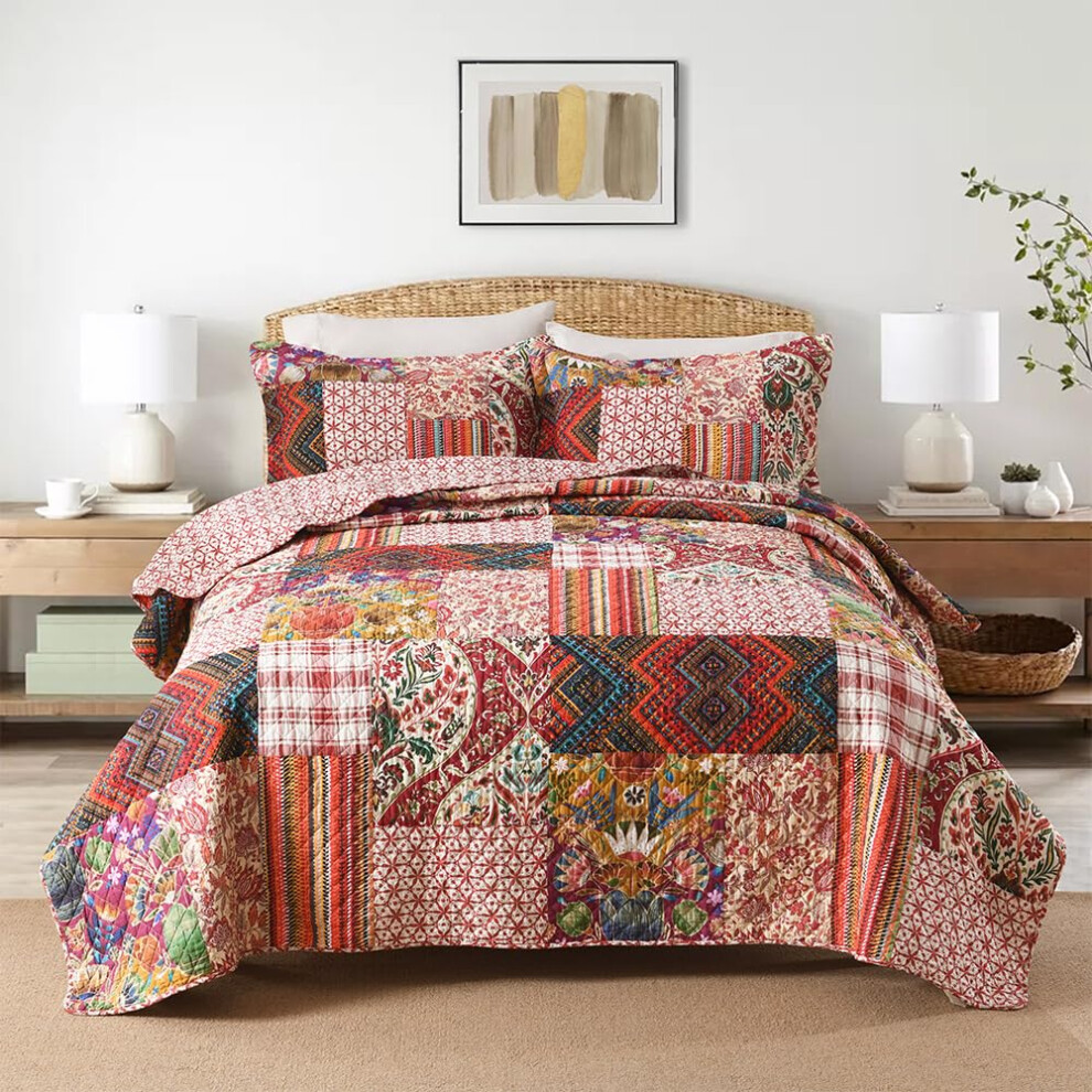 ENASAL Cotton Bedspread Quilt Sets Reversible Bedding Coverlet Sets Comforter Floral Paisley Bedspread (Red King Size)