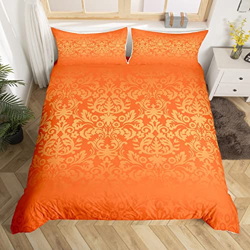 Homewish Vintage Damask Floral Bedding Sets King Size, Baroque Flower Duvet Cover Sets for Adults Women, Bright Orange Ombre Comforter Cover, Victorian Baroque Style Quilt Cover 3 Pieces